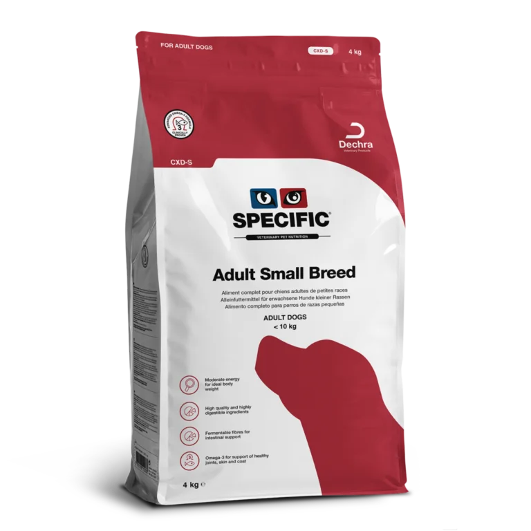 • SPECIFIC™ Adult Small Breed CXD-S to w pełni zbilansowana karma sucha przeznaczona dla dorosłych psów ras małych do 8. roku życia, o masie ciała poniżej 10 kg. Została opracowana z myślą o utrzymaniu optymalnej kondycji, zdrowia i energii na co dzień.