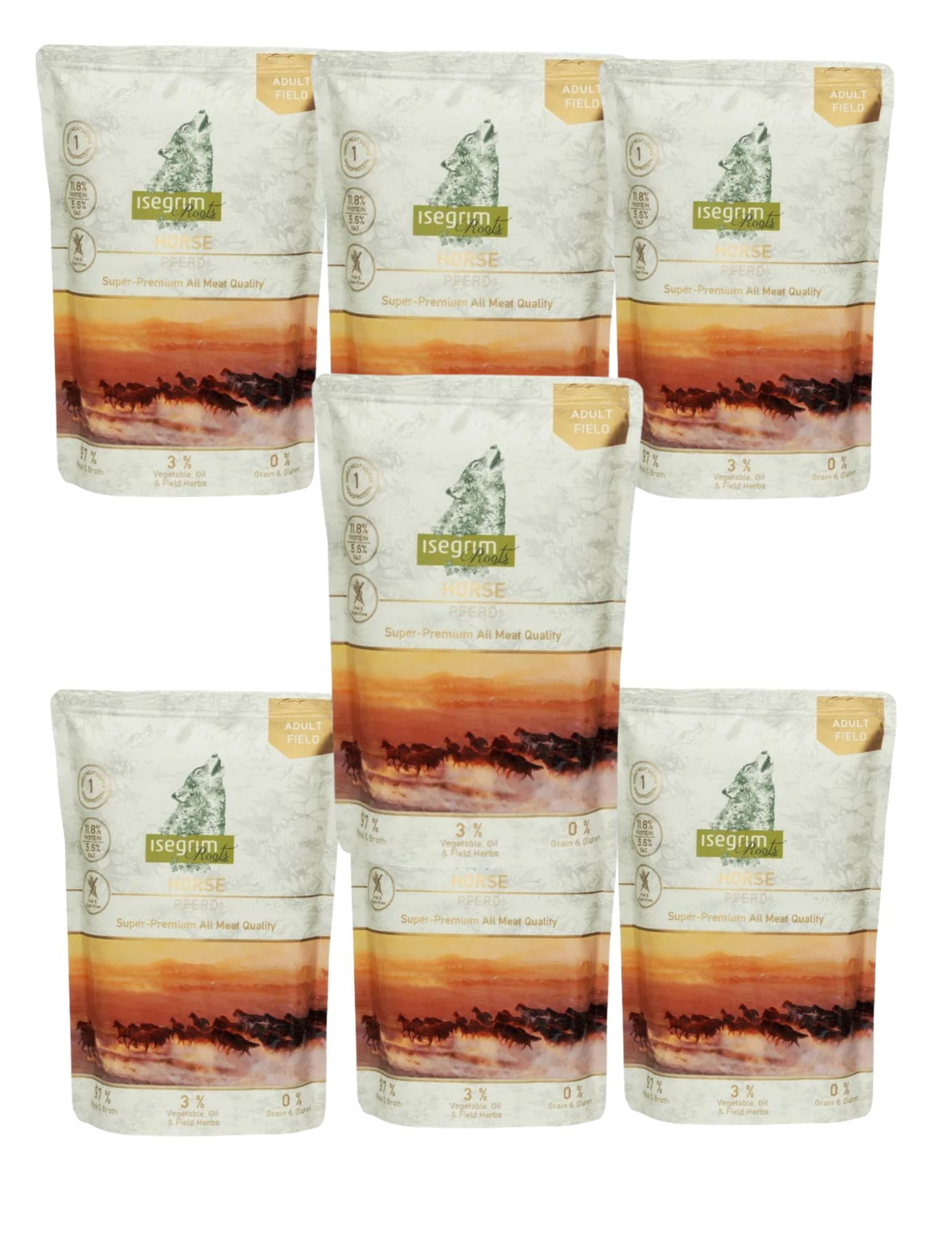 PROMOCJA Isegrim saszetki Adult Fields Konina z mieszanką warzyw i ziołami 6 x 410g plus 1 saszetka GRATIS